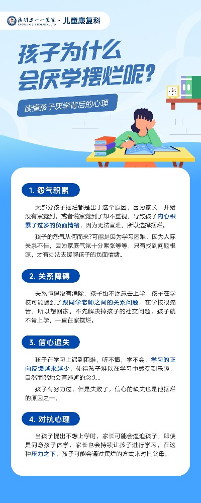 孩子厌学本身不是心理问题,但厌学现象的背后,很可能存在心理问题,大多时候家长仅直接处理厌学问题,忽略背后可能的心理问题,···