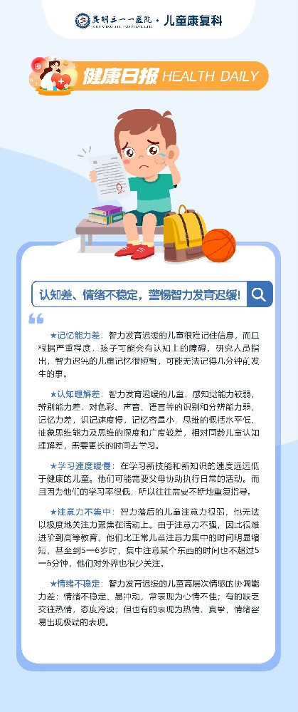 ★记忆能力差:智力发育迟缓的儿童很难记住信息,而且根据严重程度,孩子可能会有认知上的障碍。研究人员指出,智力迟钝的儿童记忆···