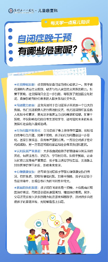 ★社交障碍加剧:社交障碍是自闭症的核心症状之一。孩子很难理解和适应社交规则,缺乏与他人建立社交关系的能力。如果干预晚,社交···