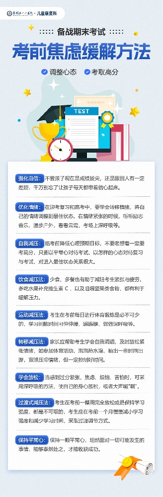 临近期末,很多孩子都会考前焦虑紧张,对考试成绩会有一定的影响,家长们一定要重视。这里整理几点建议,孩子和家长们可以这样做···